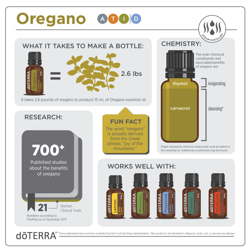 Oregano olie er en af naturens kraftigste antioxidant og stærkeste antiseptiske (bakteriedræbende) medikament. DoTERRAs Oregano æterisk olie indeholder de naturligt forekommende bestanddele carvacrol og thymol, som kan understøtte det overordnede helbred og opretholde et sundt immunsystem og er godkendt til indtagelse af de amerikanske fødevaremyndigheder. Carvacrol er et meget stærkt antoxidant og virker både bakterie- og svampedræbende. Udover at være rig på antioxidanter kan oregano olie også bidrage til at opretholde en sund mikrobiel balance og indtages som værn mod infektioner og inflammationer.